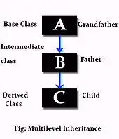 where a subclass is inherited from another subclass. It is not uncommon that a class is derived from another derived class as shown in the figure "Multilevel inheritance".