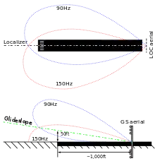 Previous blind landing radio aids typically took the form of beam systems of various types. These normally consisted of a radio transmitter that was connected to a motorized switch to produce a pattern of Morse code dots and dashes. The switch also controlled which of two directional antennae the signal was sent to. The resulting signal sent into the air consists of dots sent to one side of the runway and dashes to the other. The beams were wide enough so they overlapped in the center.[3]