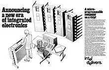 This all changed in the summer of 1971, when Ed Gelbach, formerly of Texas Instruments, took over the marketing department and immediately began plans to publicly announce the product.[27] This took place in the November 1971 when Intel ran ads "Announcing a new era of integrated electronics,"[28] first appearing in the November 15 edition of Electronic News.[29]
