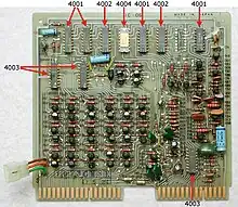 Intel's chip-naming scheme at that time used a four-digit number for each component. The first digit indicated the process technology used, the second digit indicated the generic function, and the last two digits specified the sequential number in the development of that component type. Using this convention, the chips would have been known as the 1302, 1105, 1507, and 1202. Faggin felt this would obscure the fact that they formed a coherent set, and decided to name them as the "4000 family".[24] The four chips were the following: the 4001, 256-byte 4-bit ROM; the 4002, DRAM with four 20-nibble registers; the 4003, I/O with a 10-bit static shift register with serial and parallel outputs; and the 4004 CPU. A fully expanded system could support 16 4001's for a total of 4 kB of ROM, 16 4002's for a total of 1,280 nibbles (640 bytes) of RAM, and an unlimited number of 4003's. The 4003's were connected to programmable input and output pins on the 4001 and to output pins on the 4002, not directly to the CPU.[8]
