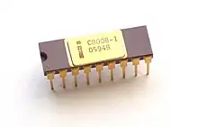 The 8008 was implemented in 10 μm silicon-gate enhancement-mode PMOS logic. Initial versions could work at clock frequencies up to 0.5 MHz. This was later increased in the 8008-1 to a specified maximum of 0.8 MHz. Instructions take between 5 and 11 T-states, where each T-state is 2 clock cycles.[11] Register–register loads and ALU operations take 5T (20 μs at 0.5 MHz), register–memory 8T (32 μs), while calls and jumps (when taken) take 11 T-states (44 μs).[12] The 8008 is a little slower in terms of instructions per second (36,000 to 80,000 at 0.8 MHz) than the 4-bit Intel 4004 and Intel 4040.[13] but since the 8008 processes data 8 bits at a time and can access significantly more RAM, in most applications it has a significant speed advantage over these processors. The 8008 has 3,500 transistors.[14][15][16]