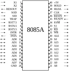 The 8085 is a conventional von Neumann design based on the Intel 8080. Unlike the 8080 it does not multiplex state signals onto the data bus, but the 8-bit data bus is instead multiplexed with the lower eight bits of the 16-bit address bus to limit the number of pins to 40. State signals are provided by dedicated bus control signal pins and two dedicated bus state ID pins named S0 and S1. Pin 40 is used for the power supply (+5 V) and pin 20 for ground. Pin 39 is used as the Hold pin.