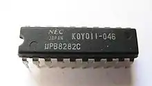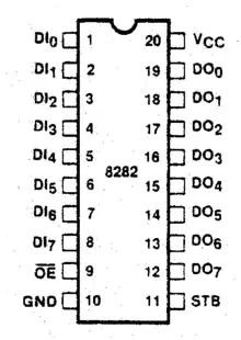 The Intel 8282 is an 8-bit latch, which was developed primarily for the Intel-8086/8087/8088/8089-processors. The component comes in 20-pin DIL package. It was licensed to companies such as NEC and Siemens. With the ROM-less versions of the MCS-48 and MCS-51 microcontroller (8035/8039 and 8031/8032) compact systems with external ROM / EPROM can be realized. The 8282 can also be used in 8080/8085-systems replacing the 8212. If OE (Output Enable) is connected to GND, the chip is selected. STB (Strobe) is connected to the pin ALE (Address Latch Enable) of the processor and takes over the address data from the multiplexed address-/databus. The 8283 has the same functionality, but the data is inverted. In 1980 the Intel 8282 and I8282 (industrial grade) version was available for 5.55 USD and 16.25 USD in quantities of 100 respectively.[1][2]