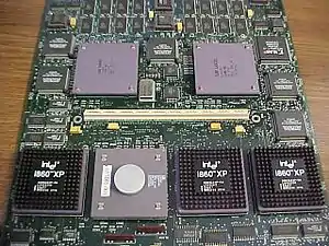 The Intel i860 (also known as 80860) is a RISC microprocessor design introduced by Intel in 1989. It is one of Intel's first attempts at an entirely new, high-end instruction set architecture since the failed Intel iAPX 432 from the beginning of the 1980s. It was the world's first million-transistor chip.[1] It was released with considerable fanfare, slightly obscuring the earlier Intel i960, which was successful in some niches of embedded systems. The i860 never achieved commercial success and the project was terminated in the mid-1990s.