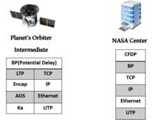 The distance between the planets and their constant motion impose long and variable delay on the communications. Thus, the traditional protocol stack doesn't function properly. Delay/Disruption Tolerant Network (DTN) is implemented to address these constraints. DTN inserts a new set of protocols, called Bundling Protocols (BPs), to the traditional protocol stack.[3] BP is a standard method of transmitting data using store-and-forward, where data are stored for a period of time at intermediate nodes along a network path, and forwarded to the next station when a link is available. Licklider Transmission Protocol (LTP) is a BP and a transport protocol that functions in deep space. For an example of a dataflow with an intermediate space satellite between the deep space and the earth, see the figure. The intermediate node has two transport protocols, LTP (for data transmission over deep space communication links), and TCP (for transmission over earth communication links). The intermediate node turns the received data from LTP packets into TCP packets using their underlying convergence layer protocols.[4][5] The protocols in the lower layers might change to support the corresponding communication and network.
