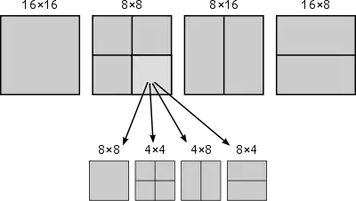 Luminance block partition of 16×16 (MPEG-2), 16×8, 8×16, and 8×8. The last case allows the division of the block into new blocks of 4×8, 8×4, or 4×4.