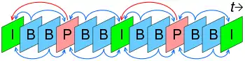 This structure suggests a problem because the fourth frame (a P-frame) is needed in order to predict the second and the third (B-frames). So we need to transmit the P-frame before the B-frames and it will delay the transmission (it will be necessary to keep the P-frame). This structure has strong points: