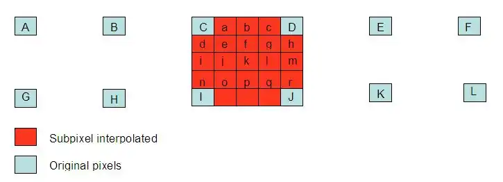 While MPEG-2 allowed a ½ pixel resolution, Inter frame allows up to ¼ pixel resolution. That means that it is possible to search a block in the frame to be coded in other reference frames, or we can interpolate nonexistent pixels to find blocks that are even better suited to the current block. If motion vector is an integer number of units of samples, that means it is possible to find in reference pictures the compensated block in motion. If motion vector is not an integer, the prediction will be obtained from interpolated pixels by an interpolator filter to horizontal and vertical directions.