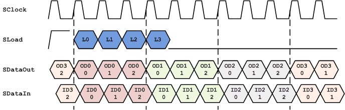 The figure below shows the relationship between SClock, SLoad and the two data bits named SDataOut and SDataIn. An SGPIO frame is started after SLoad has been low for at least 5 SClock cycles.