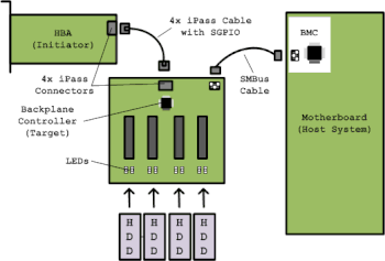 In a typical system architecture, the host bus adapter (HBA) connects to a backplane through a 4× iPass cable. The SGPIO-signals run inside this cable. The backplane may then optionally connect to the baseboard management controller of a motherboard through an I²C or SMBus.