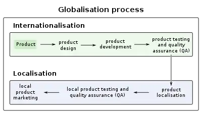 A globalization method includes, after planning, three implementation steps: internationalization, localization and quality assurance.[2]