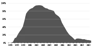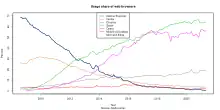 Internet Explorer was once the most widely used web browser, attaining a peak of 95% usage share by 2003.[11] It has since fallen out of general use after retirement. This came after Microsoft used bundling to win the first browser war against Netscape, which was the dominant browser in the 1990s. Its usage share has since declined with the launches of Firefox (2004) and Google Chrome (2008) and with the growing popularity of mobile operating systems such as Android and iOS that do not support Internet Explorer. Microsoft Edge, IE's successor, first overtook Internet Explorer in terms of market share in November 2019. Versions of Internet Explorer for other operating systems have also been produced, including an Xbox 360 version called Internet Explorer for Xbox and for platforms Microsoft no longer supports: Internet Explorer for Mac and Internet Explorer for UNIX (Solaris and HP-UX), and an embedded OEM version called Pocket Internet Explorer, later rebranded Internet Explorer Mobile, made for Windows CE, Windows Phone, and, previously, based on Internet Explorer 7, for Windows Phone 7.