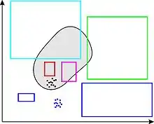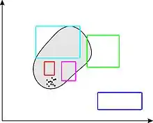 Figure 1 represents the set X painted grey and some boxes, some of them degenerated (i.e., they correspond to singletons). Figure 2 represents these boxes after contraction. Note that no point of X has been removed by the contractor. The contractor is minimal for the cyan box but is pessimistic for the green one. All degenerated blue boxes are contracted to the empty box. The magenta box and the red box cannot be contracted.