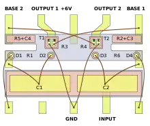 In April 1960, Texas Instruments announced multivibrator #502 as the world's first integrated circuit available on the market. The company assured that contrary to the competitors they actually sell their product, at a price of US$450 per unit or US$300 for quantities larger than 100 units.[68] However, the sales began only in the summer of 1961, and the price was higher than announced.[70] The #502 schematic contained two transistors, four diodes, six resistors and two capacitors, and repeated the traditional discrete circuitry.[71] The device contained two Si strips of 5 mm length inside a metal-ceramic housing.[71] One strip contained input capacitors; the other accommodated mesa transistors and diodes, and its grooved body was used as six resistors. Gold wires acted as interconnections.[72]