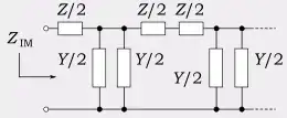 For a symmetrical network, the iterative impedance and image impedance are identical and are the same at both ports. This impedance is sometimes called the network's characteristic impedance, a term usually reserved for transmission lines.[10] The model for a transmission line is an infinite chain of L-sections with infinitesimally small components. A transmission line characteristic impedance is thus the limiting case of a ladder network iterative impedance.[11][5][6][12]