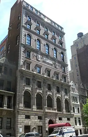The synagogue was founded in 1918 by prosperous Jews moving into the Upper West Side of Manhattan, a neighborhood that was just being built along the new IRT subway line. The large synagogue is in a tall Neo-Classical building at 131 West 86th Street that contains a large number of social halls, classrooms, auditoriums and offices in addition to the Neo-Classical main sanctuary.[1] The synagogue was the first in America to be built not only to serve as spiritual home to its members, but also as a cultural, social and recreational home. The synagogue's members affectionately refer to the synagogue as "The first Shul with a Pool."[2] It continues to support a variety of educational and social programming.