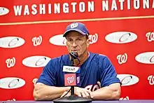 Riggleman was named bench coach for the Washington Nationals for the 2009 season, and was promoted to interim manager on July 12, 2009, following Manny Acta's midseason dismissal.[9] Riggleman picked McLaren as his bench coach. Riggleman hired Burton Rocks as his agent to negotiate his managerial deal with the Washington Nationals in November 2009.[10][11] The Nationals retained Riggleman as manager for the 2010 and 2011 seasons, but on June 23, 2011, he resigned as manager of the Nationals after a win against the Seattle Mariners and after the team won 11 of its previous 12 games. Riggleman was unhappy the team had yet to pick up his contract option for the 2012 season. He said he told team management before the game he "wanted to have a conversation" about his contract before the team left for a series against the Chicago White Sox, but "they didn't want to do that", so he offered his resignation. "I'm 58, I'm too old to be disrespected", he said.[12][13] He finished with a record of 140 wins and 172 losses.[7]