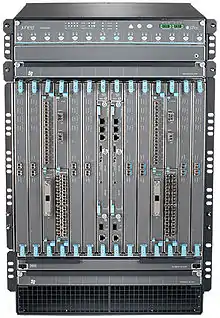 By 2004, Juniper controlled 38% of the core router market.[36] By 2007, it had a 5%, 18% and 30% share of the market for enterprise, edge and core routers respectively.[37] Alcatel-Lucent was unsuccessful in challenging Juniper in the core router market but continued competing with Juniper in edge routers along with Cisco.[38][39]