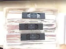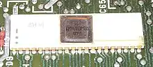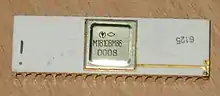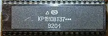 The K1810VM86 (Russian: К1810ВМ86)[1][2] is a Soviet 16-bit microprocessor, a clone of the Intel 8086 CPU with which it is binary and pin compatible. It was developed between 1982 and 1985.[3] The original K1810VM86 supported a clock frequency of up to 5 MHz while up to 8 MHz were allowed for the later K1810VM86M (К1810ВМ86M; corresponding to Intel 8086-2).[3] The K1810VM86 was manufactured plastic 40-pin dual in-line package (as KR1810VM86 / КР1810ВМ86) or in a 40-pin ceramic dual in-line package (as KM1810VM86 / КМ1810ВМ86 for the commercial version or M1810VM86 / М1810ВМ86 for the military version). A clone of the related Intel 8088 with its 8-bit bus was manufactured as the K1810VM88 (Russian: К1810ВМ88), also in plastic and ceramic packages.