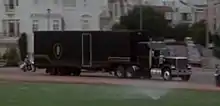 KITT has access to a mobile "garage" called the F.L.A.G. Mobile Command Center, a semi-trailer truck owned by the Foundation. In most episodes, it is a GMC General. The trailer has an extendable ramp that drops down and allows KITT to drive inside even when the truck is in motion. The trailer is loaded with spare parts and equipment for KITT, and also has a computer lab where technicians Bonnie or April would work and conduct repairs and maintenance while in transit. In "KITTnap", KITT is kidnapped and Michael and RC3 use the tractor cab (which has been disconnected from the trailer) to go and find him.