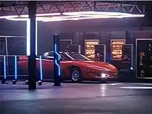The studio was unable to use the real Pontiac Banshee IV concept car for the movie, so instead it hired Jay Ohrberg Star Cars Inc. to customize a 1991 Dodge Stealth[13] for the Knight 4000.[14] After filming wrapped, the custom car was used on other TV productions of the time and can also be seen, albeit briefly, as a stolen supercar in CHiPs '99,[12] as repainted future police vehicles in Power Rangers Time Force, in an episode of the television series Black Scorpion in March 2001, and in a hidden camera TV series called Scare Tactics. After being abandoned and unmaintained for 10 years, one of the screen-used cars was offered for sale in January 2021 by Bob's Prop Shop in Las Vegas.[15]