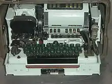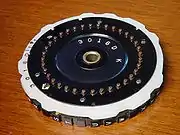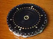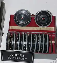 The TSEC/KL-7, also known as Adonis[1] was an off-line non-reciprocal rotor encryption machine.[3]: p.33ff [4] The KL-7 had rotors to encrypt the text, most of which moved in a complex pattern, controlled by notched rings. The non-moving rotor was fourth from the left of the stack. The KL-7 also encrypted the message indicator.