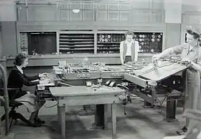 After two or three months, Antonelli and Bilas were moved to work on the differential analyser in the basement of the Moore School, the largest and most sophisticated analogue mechanical calculator of the time, of which there were only three in the United States and five or six in the world (all of the others were in Great Britain). The analyser had been lent to the University of Pennsylvania for the duration of the war.[7] Using the analyser (invented by Vannevar Bush of MIT a decade prior and made more precise with improvements by the Moore School staff), a single trajectory computation—about 40 hours of work on a mechanical desk calculator—could be performed in about 50 minutes. Antonelli was further promoted to supervising calculations on the analyser.[2] The analyser room staff worked six days a week, with their only official holidays as Christmas and the Fourth of July.[7][14]
