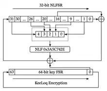 KeeLoq is a proprietary hardware-dedicated block cipher that uses a non-linear feedback shift register (NLFSR). The uni-directional command transfer protocol was designed by Frederick Bruwer of Nanoteq (Pty) Ltd., the cryptographic algorithm was created by Gideon Kuhn at the University of Pretoria, and the silicon implementation was by Willem Smit at Nanoteq (Pty) Ltd (South Africa) in the mid-1980s. KeeLoq was sold to Microchip Technology Inc in 1995 for $10 million.[1] It is used in 'hopping code' encoders and decoders such as NTQ105/106/115/125D/129D, HCS101/2XX/3XX/4XX/5XX and MCS31X2. KeeLoq has been used in many remote keyless entry systems by such companies like Chrysler,[2] Daewoo, Fiat, Ford,[3] GM, Honda, Mercedes-Benz,[3] Toyota, Volvo, Volkswagen Group, Clifford, Shurlok, and Jaguar.[3]