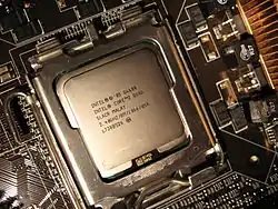 Kentsfield is the code name of the first Intel desktop Core 2 Quad and quad-core Xeon CPUs,[1] released on November 2, 2006. The top-of-the-line Kentsfields were Core 2 Extreme models numbered QX6x00, while the mainstream Core 2 Quad models were numbered Q6x00. All of them featured two 8 MiB L2 cache. The mainstream 65 nanometer Core 2 Quad Q6600, clocked at 2.4 GHz, was launched on January 8, 2007 at US$851 (reduced to US$530 on April 7, 2007). July 22, 2007 marked the release of the Core 2 Quad Q6700 and Core 2 Extreme QX6850 Kentsfields at US$530 and US$999 respectively; the price of the Q6600 was later reduced to US$266.[2] Both Kentsfield and Kentsfield XE use product code 80562.