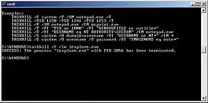Microsoft Windows XP, Vista and 7 include the command taskkill[5] to terminate processes. The usual syntax for this command is taskkill /im "IMAGENAME". An "unsupported" version of kill was included in several releases of the Microsoft Windows Resource Kits available for Windows 98.[6]