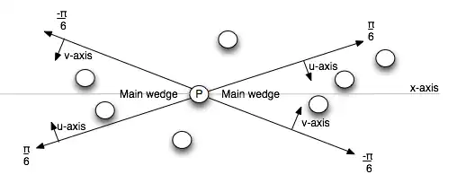 - Map each point p=(x, y) in the set P to a new point p' = (u, v) = (x+√3y, y-√3x), forming the set P' of transformed points. Note that for a point p, the points in the "main" wedges have u and v coordinates either larger or smaller than p' in this new coordinate system.