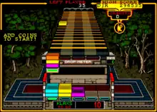 The paddle can hold up to five tiles at any given moment. The player is penalized with one "drop" whenever a tile falls off the conveyor without being caught or while the paddle is full. Pushing up on the joystick will flip the topmost tile on the paddle a short distance up the conveyor, while pulling down accelerates the motion of the tiles.