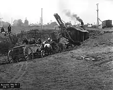 Kodak had opened its Canadian operations on November 8, 1899, first on Colborne Street and then King Street in the downtown core. By 1912 the company was growing so rapidly that a new corporate campus was needed. George Eastman personally visited Toronto to view potential sites, eventually selecting the Mount Dennis area, which at that time was farmland. In 1913 the company purchased 10 hectares (25 acres) at $12,000 per hectare ($5,000/acre) and began construction as soon as the deed was transferred. A series of seven buildings were initially constructed, including two that were connected by an enclosed bridge. The first to be completed, Building 1, was the power plant, which connected to the Canadian Pacific Railway just south of the plant with a spur that ended inside the building. It burned about 500 tonnes of coal a day. The move from the King Street facilities began in 1916, completed the next year.[6]