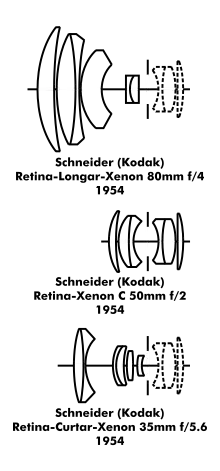 The standard Retina-Xenon lens is a 50 mm lens with a different maximum aperture, depending on the camera. The maximum aperture of the standard Retina-Xenon fitted to the IIc/IIC was f/2.8, while the IIIc/IIIC was equipped with a faster f/2 version.[3] The Retina Reflex was equipped with either a Schneider-Kreuznach Retina-Xenon or a Rodenstock Retina-Heligon, both f/2.[1]: 332 For each camera, the standard lens is a six-element, four-group Double-Gauss lens split into two parts: a set of three front elements that can be removed and a permanently-fixed set of three rear elements, set behind the aperture and shutter.[4]