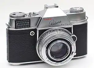 The Kodak Type 025 Retina Reflex is an SLR camera that uses convertible lenses (German: Wechselobjektiv), made by Kodak Stuttgart, Germany. It was made between Spring 1957 and October 1958. Like many 35 mm SLR cameras of West German heritage it is equipped with a leaf shutter instead of a focal plane shutter. It was named Type 025 Retina Reflex since it inherited several features from the contemporary Retina rangefinder cameras, like the Retina IIIc: The film advance and exposure counting system, the film channel, the selenium meter, and the focusing mechanics of the lenses. Even the Synchro-Compur shutter is very similar to the earlier designs.