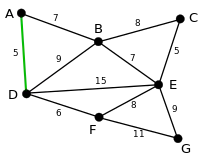 AD and CE are the shortest edges, with length 5, and AD has been arbitrarily chosen, so it is highlighted. |