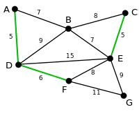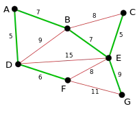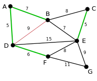 The next-shortest edges are AB and BE, both with length 7. AB is chosen arbitrarily, and is highlighted. The edge BD has been highlighted in red, because there already exists a path (in green) between B and D, so it would form a cycle (ABD) if it were chosen. |