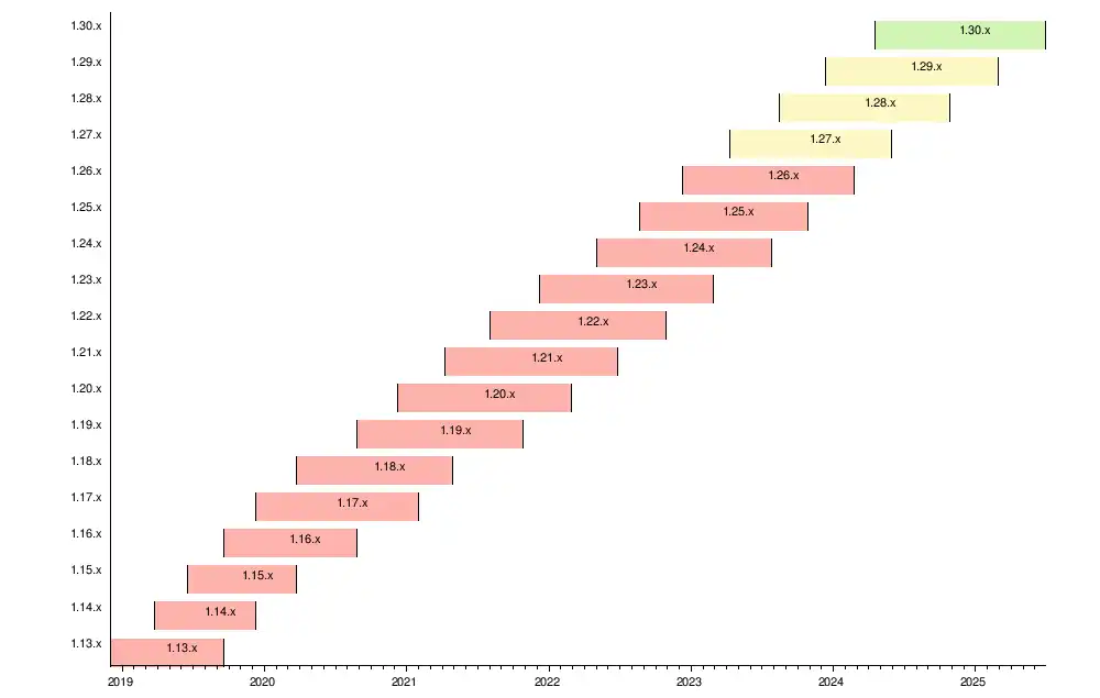 Until version 1.18, Kubernetes followed an N-2 support policy, meaning that the three most recent minor versions receive security updates and bug fixes.[27] Starting with version 1.19, Kubernetes follows an N-3 support policy.[28]