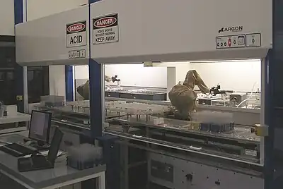Laboratory robotics is the act of using robots in biology, chemistry or engineering labs. For example, pharmaceutical companies employ robots to move biological or chemical samples around to synthesize novel chemical entities or to test pharmaceutical value of existing chemical matter.[1][2] Advanced laboratory robotics can be used to completely automate the process of science, as in the Robot Scientist project.[3]