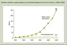 In many countries, landline service has not been readily available to most people. In some countries in Africa, the rise in cell phones has outpaced growth in landline service. Between 1998 and 2008, Africa added only 2.4 million landlines.[5] In contrast, between 2000 and 2008, cell phone use rose from fewer than 2 in 100 people to 33 out of 100.[5] There has also been a substantial decline of landline phones in the Indian subcontinent, in urban and even more in rural areas.
