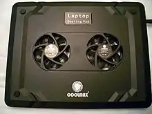 A laptop/notebook cooler, cooling pad, cooler pad or chill mat is an accessory for laptop computers intended to reduce their operating temperature when the laptop is unable to sufficiently cool itself. Laptop coolers are intended to protect both the laptop from overheating and the user from suffering heat related discomfort.[1] A cooling pad may house active or passive cooling methods and rests beneath the laptop. Active coolers move air or liquid to direct heat away from the laptop quickly, while passive methods may rely on thermally conductive materials or increasing passive airflow.