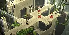 As the player progresses, the game's puzzles become more complex. Successive levels introduce new game mechanics and enemy types.[3] Enemies take the form of deadly creatures such as snakes, lizards, and giant spiders. Each enemy type has a specific movement pattern. Single-use items, such as spears, can be collected on levels and then used to dispatch enemies from a distance.[3][4] Other mechanics include obstacles such as boulders, saw blades, and traps to avoid.[3] The player can activate levers, which shift walls and platforms to open paths through the level.[4] Lara Croft Go also features optional in-app purchases, which provide hints to the puzzles.[3]