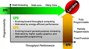 As a GPU, Larrabee would have supported traditional rasterized 3D graphics (Direct3D & OpenGL) for games. However, its hybridization of CPU and GPU features should also have been suitable for general purpose GPU (GPGPU) or stream processing tasks. For example, it might have performed ray tracing or physics processing,[10] in real time for games or offline for scientific research as a component of a supercomputer.[11]