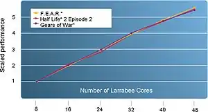 Intel's SIGGRAPH 2008 paper describes cycle-accurate simulations (limitations of memory, caches and texture units was included) of Larrabee's projected performance.[14] Graphs show how many 1 GHz Larrabee cores are required to maintain 60 frame/s at 1600×1200 resolution in several popular games. Roughly 25 cores are required for Gears of War with no antialiasing, 25 cores for F.E.A.R with 4× antialiasing, and 10 cores for Half-Life 2: Episode Two with 4× antialiasing. Intel claimed that Larrabee would likely run faster than 1 GHz, so these numbers do not represent actual cores, rather virtual timeslices of such. Another graph shows that performance on these games scales nearly linearly with the number of cores up to 32 cores. At 48 cores the performance drops to 90% of what would be expected if the linear relationship continued.[23]