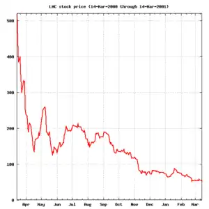 Two weeks after listing, the share price had dropped to 270p.[9] In the first week of April, the shares dipped below 190p, half the issue price.[10] On Monday, 17 April 2000, after the biggest ever one-day fall in the New York stock market the preceding Friday,[11] £35bn were wiped off the value of the London Stock Exchange. By now, lastminute.com was trading at 30% of its flotation price.[12][13]