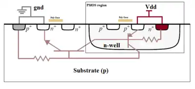 In CMOS technology, there are a number of intrinsic bipolar junction transistors. In CMOS processes, these transistors can create problems when the combination of n-well/p-well and substrate results in the formation of parasitic n-p-n-p structures. Triggering these thyristor-like devices leads to a shorting of the Vdd and GND lines, usually resulting in destruction of the chip, or a system failure that can only be resolved by power-down.[9]