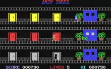 The main screen in Lazy Jones is the hotel interior. There, the character can use the elevator to travel freely between the three floors, but he must watch out for enemies: the current hotel manager on the top floor, the ghost of the previous manager on the bottom floor, and a haunted cleaning cart on the middle floor. The enemies only walk around and do not pursue the character, but contact with them is fatal.