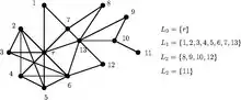 Given a connected graph G = (V, E) with V the set of vertices and E the set of edges, and with a root vertex r, the level structure is a partition of the vertices into subsets Li called levels, consisting of the vertices at distance i from r. Equivalently, this set may be defined by setting L0 = {r}, and then, for i > 0, defining Li to be the set of vertices that are neighbors to vertices in Li − 1 but are not themselves in any earlier level.[1]