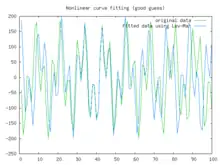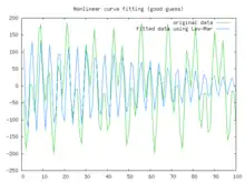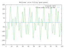 In this example we try to fit the function using the Levenberg–Marquardt algorithm implemented in GNU Octave as the leasqr function. The graphs show progressively better fitting for the parameters , used in the initial curve. Only when the parameters in the last graph are chosen closest to the original, are the curves fitting exactly. This equation is an example of very sensitive initial conditions for the Levenberg–Marquardt algorithm. One reason for this sensitivity is the existence of multiple minima — the function has minima at parameter value and .