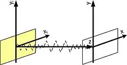Assuming the system looks like as depicted in the figure, the wave travels from the (xi, yi) plane to the (x, y) plane. The Fresnel transform is used to describe electromagnetic wave propagation in free space: